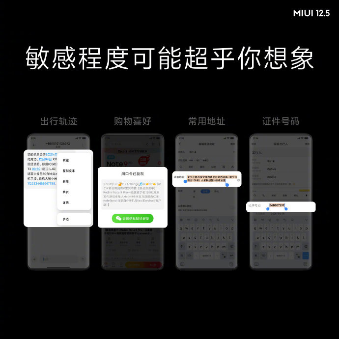 Xiaomi เคลมว่าได้รับการยอมรับด้านความปลอดภัยจากผู้งาน หน่วยงานระดับประเทศ และสื่อต่าง ๆ มาตั้งแต่ MIUI 12 ด้วยการให้แอปต่าง ๆ เข้าถึงข้อมูลความเป็นส่วนตัวของผู้ใช้น้อยลง โดยใน MIUI 12.5 ได้มีการปรับปรุงและเพิ่มระบบป้องกันความเป็นส่วนตัวให้มีความปลอดภัยมากกว่าเดิม ไม่ว่าจะเป็น คลิปบอร์ด, ตำแหน่งของมือถือ, ไฟล์กับข้อมูลส่วนตัว และเว็บไซต์