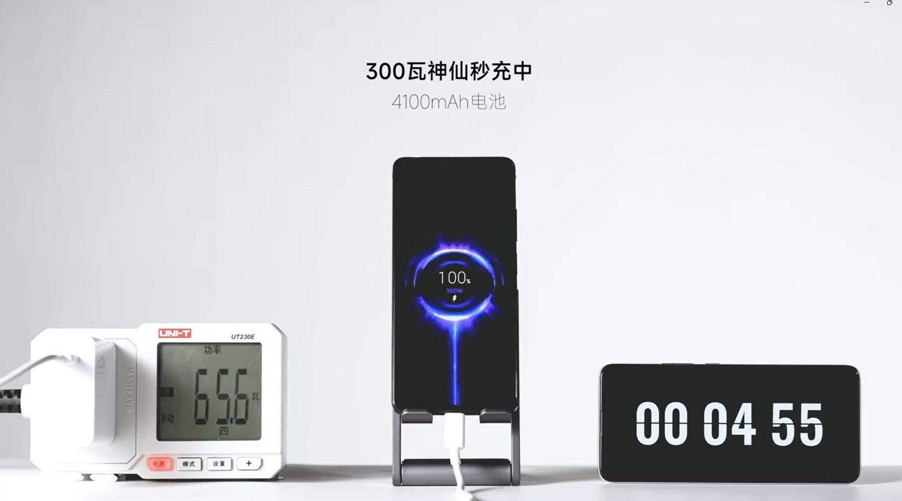 มือถือที่นำมาชาร์จไวคราวนี้ เป็นรุ่น Redmi Note 12 Discovery ที่ถูกนำมาดัดแปลง ข้างในจึงเป็นแบตเตอรี่ขนาด 4100mAh (ปกติเป็น 4300mAh) และรองรับการชาร์จ 300W จากวิดีโอพบว่าสามารถชาร์จถึง 50% ได้ภายใน 2 นาที 11 วินาที และพอถึง 4 นาที 54 วินาที แบตเตอรี่ก็เต็ม 100% เรียบร้อย