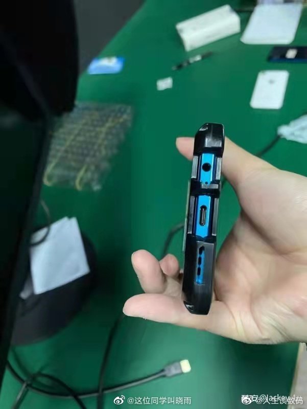 นอกจากนี้ยังโชว์ให้เห็นสีของตัวเครื่องที่ใช้สีน้ำเงิน และยังคงมีรูหูฟัง 3.5 มม. อยู่ที่ขอบเครื่องด้านล่าง รวมกับลำโพง และพอร์ต USB-C ส่วนช่องเสียบซิมการ์ด+ microSD จะอยู่ที่ขอบเครื่องด้านซ้ายบน