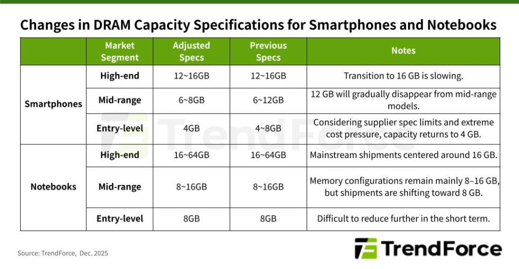 รายงานจาก TrendForce ระบุว่า ปัญหาการขาดแคลน DRAM กำลังทวีความรุนแรงขึ้นอย่างต่อเนื่อง เนื่องจากกำลังการผลิตจำนวนมากถูกดึงไปใช้ในตลาด AI ดาต้าเซ็นเตอร์ และเซิร์ฟเวอร์ระดับองค์กร ส่งผลให้หน่วยความจำสำหรับอุปกรณ์ผู้บริโภคมีต้นทุนสูงขึ้นอย่างมีนัยสำคัญ ผู้ผลิตโน้ตบุ๊กจึงเริ่มปรับโครงสร้างสเปกสินค้าเพื่อคุมต้นทุนและรักษาระดับราคาได้