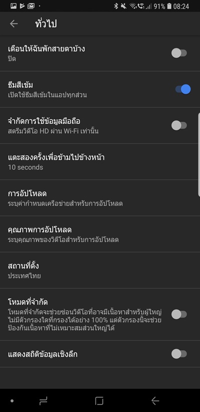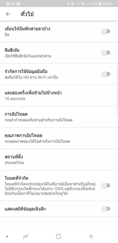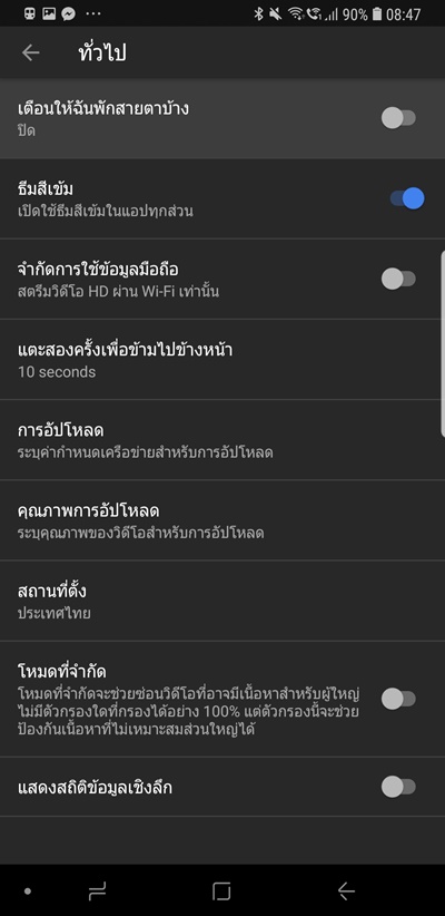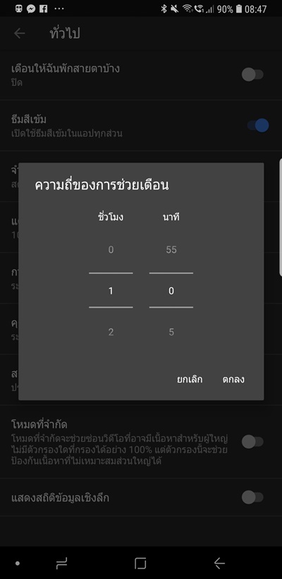 คราวนี้เราก็จะไม่แสบตาเวลาดู YouTube ในที่แสงน้อยหรือเวลากลางคืนแล้ว อีกออปชั่นนึงที่อยากให้เปิดคือบรรทัดแรกเลย คือเตือนให้พักสายตาจากการจ้องหน้าจอบ้าง ลองปรับเอาไว้สักชั่วโมงก็ได้ แล้วก็พักสายตาด้วยการกรอกตาไปมาหรือมองไกลๆ คลายกล้ามเนื้อตา หยุดเพ่งกันบ้างนะครับyoutube