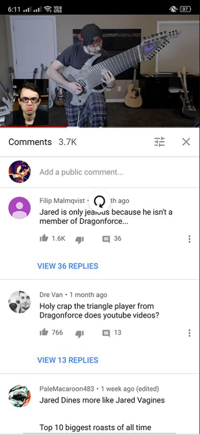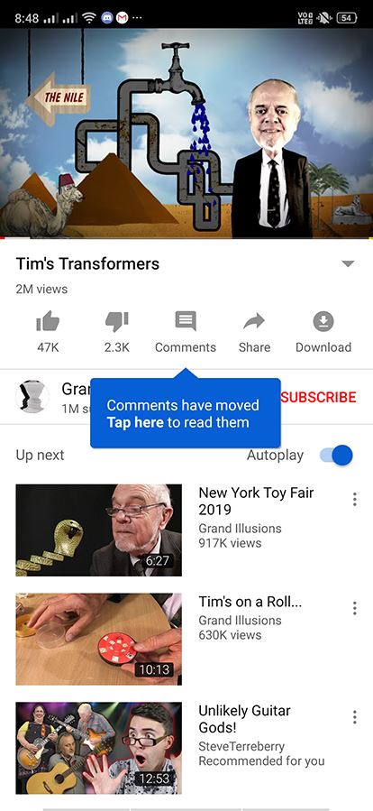 ซึ่งด้านใต้ตรงส่วนของวีดีโอที่แนะนำนั้นจะถูกเปลี่ยนเป็นข้อความ “Looking for comments?” เพื่อนำเราไปยังแท็บของ comments ที่อยู่ระหว่าง ปุ่ม Dislike และปุ่ม Share โดยทาง YouTube ได้แยกส่วน comments ขึ้นมาใหม่ช่วยให้เราสามารถอ่านความคิดเห็นได้ง่ายขึ้นเพียงใช้นิ้วโป้งกดเข้าไป ก็จะพบหน้าตาของช่อง comments ที่แทบจะไม่ต่างจากเดิมเลย