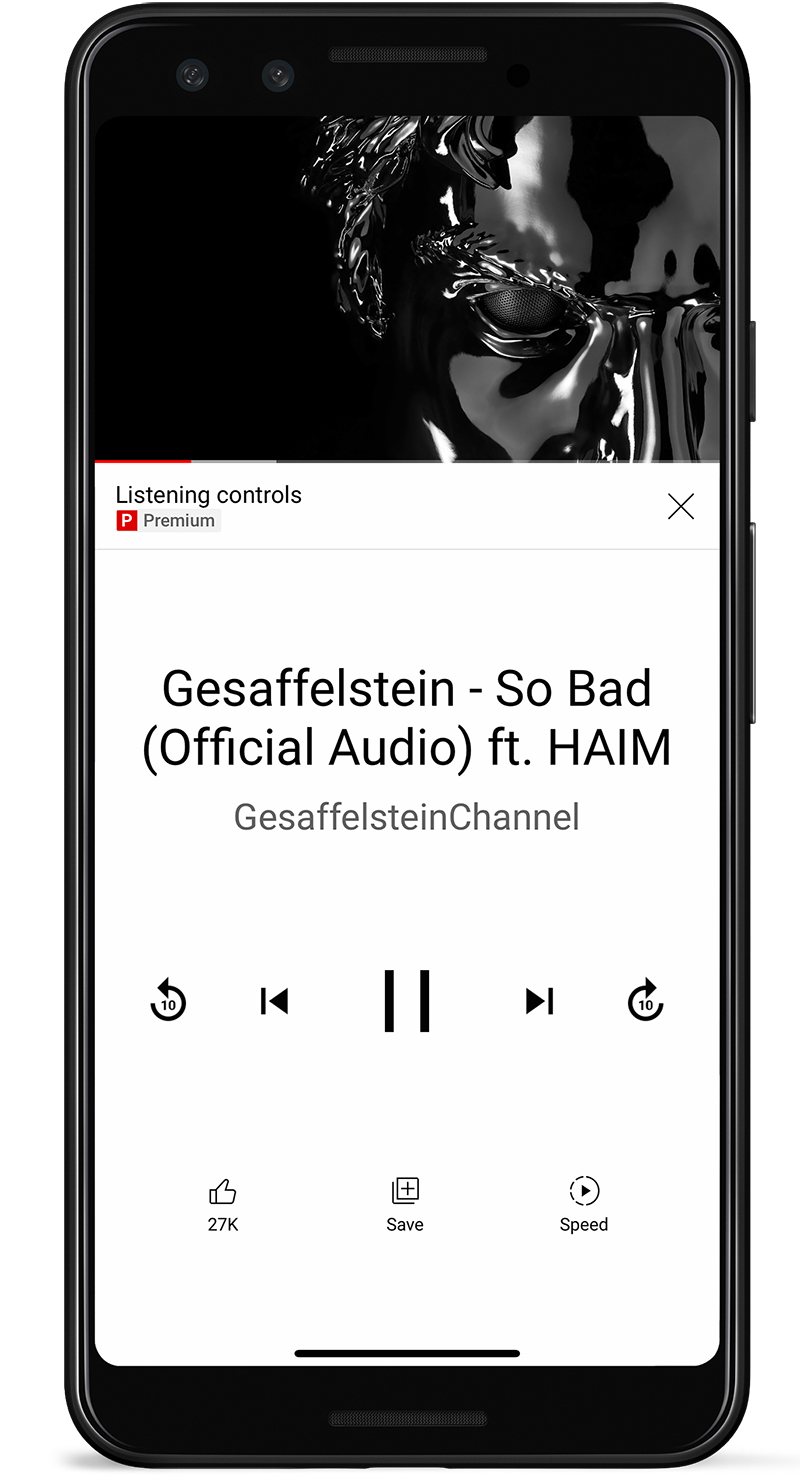 เมื่อเราเล่นเพลงหรือมิวสิกวิดีโอใด ๆ บน YouTube จะปรากฏกล่องข้อความ “Show listening controls” ขึ้นมา หากแตะไปแล้วระบบจะสลับอินเทอร์เฟซเป็นแบบใหม่แทน ตามที่เห็นดังภาพ และสามารถใช้งานขณะแคสต์วิดีโอไปยังอุปกรณ์อื่นได้ด้วย